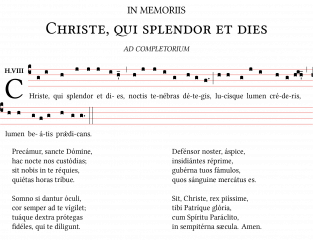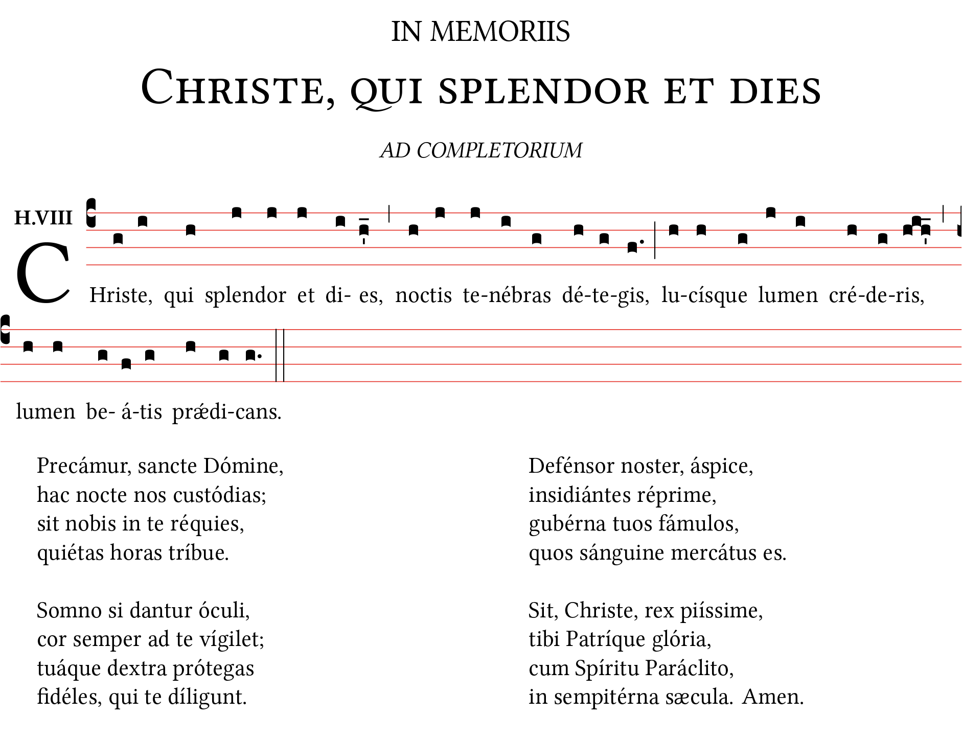 Hymnus CHRISTE, QUI SPLENDOR, In memoriis. Notazione quadrata su foglio A4.