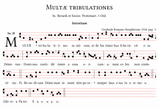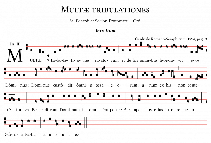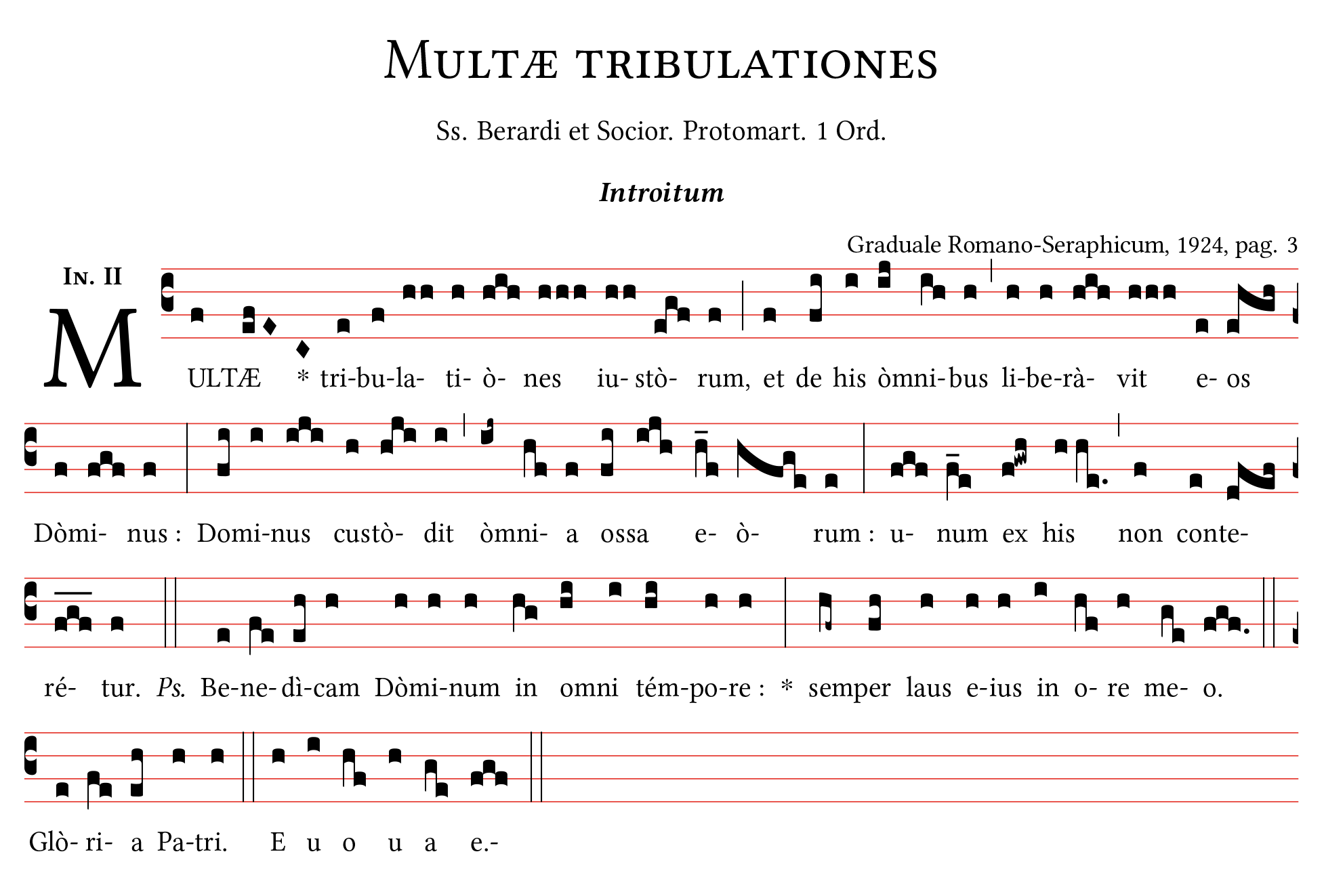 Introitus MULTAE TRIBULATIONES IUSTORUM, notazione quadrata su foglio A4.
