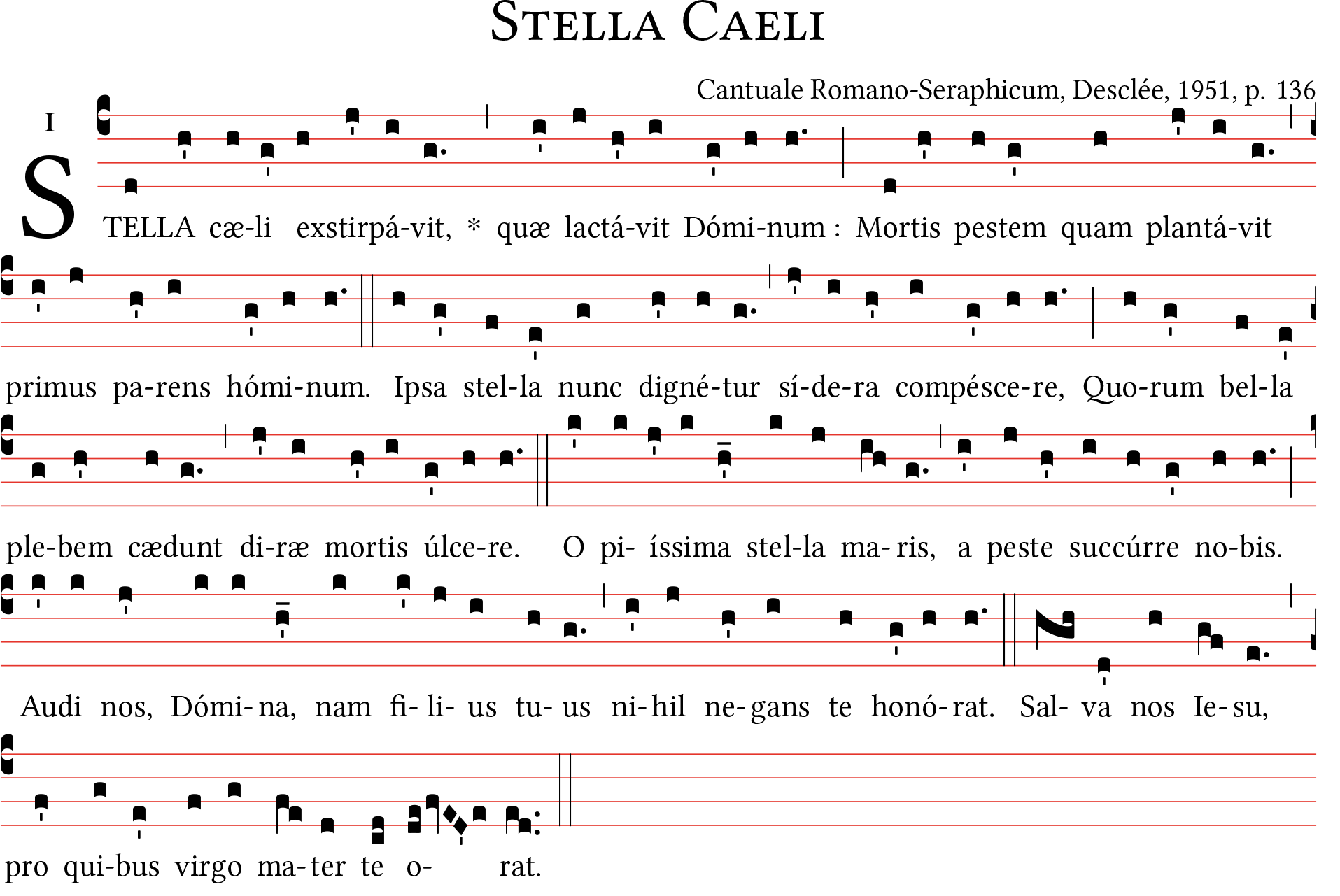 Varia, Stella Caeli, antifona mariana contro la peste. Cantuale Romano-Seraphicum, 1951, pag. 136. Notazione quadrata su foglio A4.